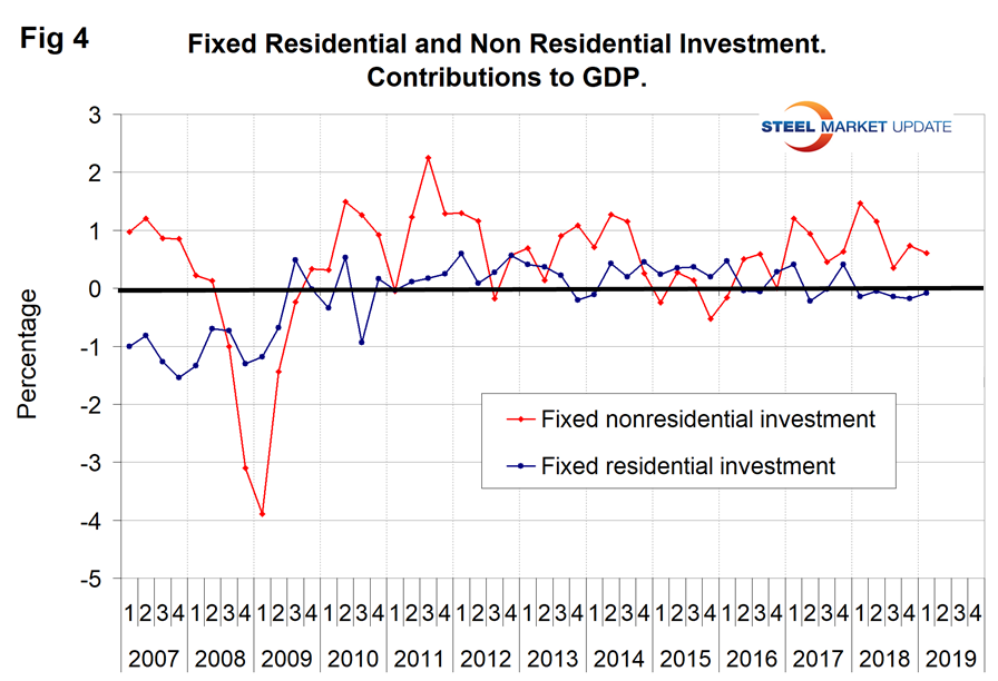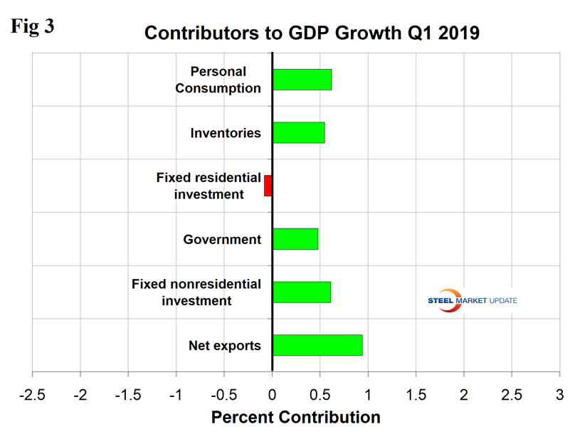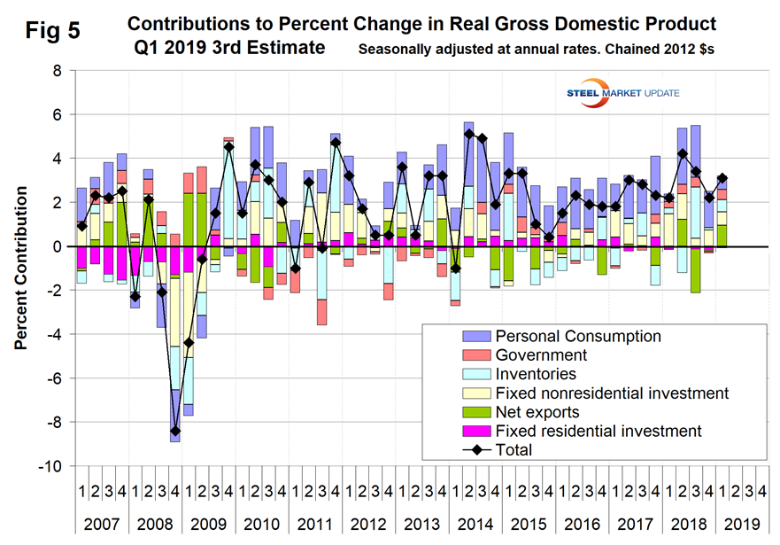 SMU Comment: The trailing 12-month growth rate has improved steadily since Q2 2016. On this basis, which we think is the best way to look at the data, Q1 2019 was the highest result since Q2 2015. The bad news is that personal consumption expenditures made their second lowest contribution since Q2 2013. The latest result was inflated by the contributions of net exports and an increase in inventories.