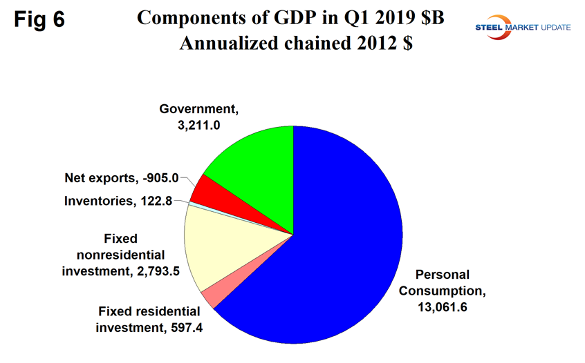 Figure 5 shows the quarterly contributors of the six major subcomponents of GDP since Q1 2007. This chart clearly shows the whipsaw effect of inventory changes, which are coded pale blue. It also shows the unusually low contribution of personal consumption expenditures in Q1 2019.