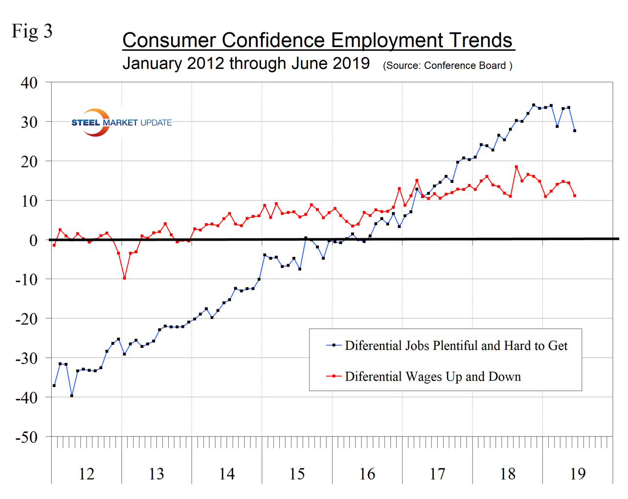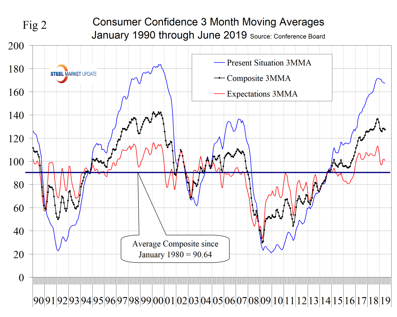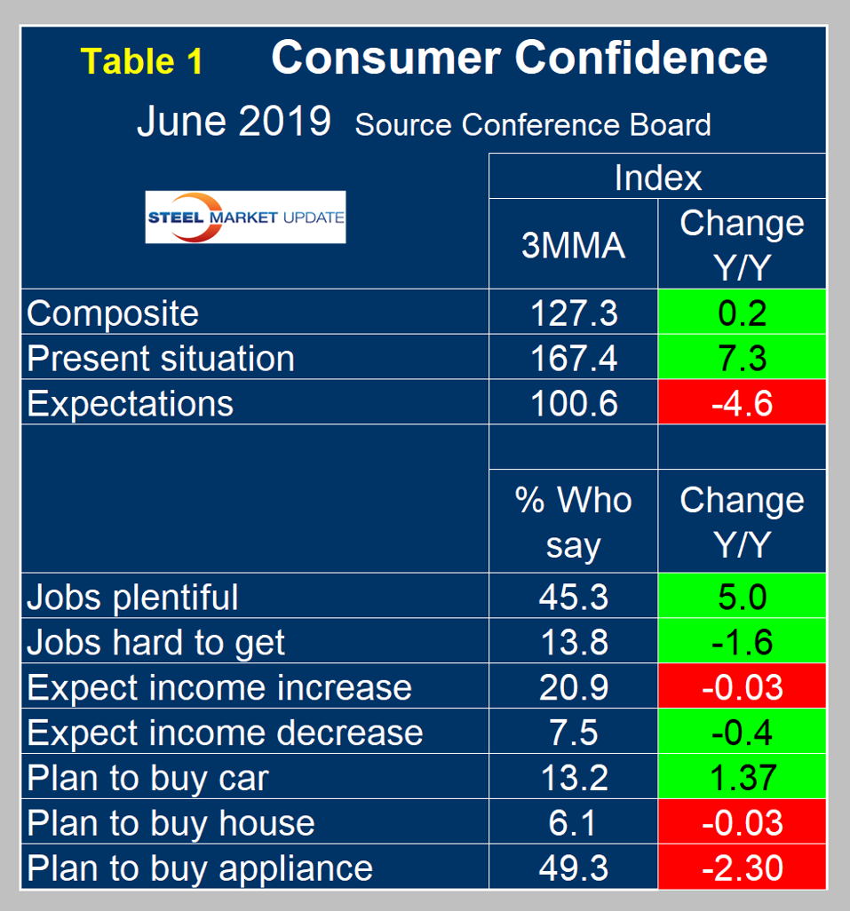 SMU Comment: The Conference Board Consumer Confidence Index is a volatile measure and must be reviewed as a three-month moving average to obtain a realistic view of trends. On that basis, it is clear that confidence is declining though not by as much as the single month of June result would suggest. Employment trends are still good though weakening. Plans to buy a car have been trending up for a year as plans to buy a house have been flat for the same timeframe. Steel demand is dependent on the growth of GDP, which in turn is strongly influenced by consumer confidence, disposable income and a willingness to spend.
