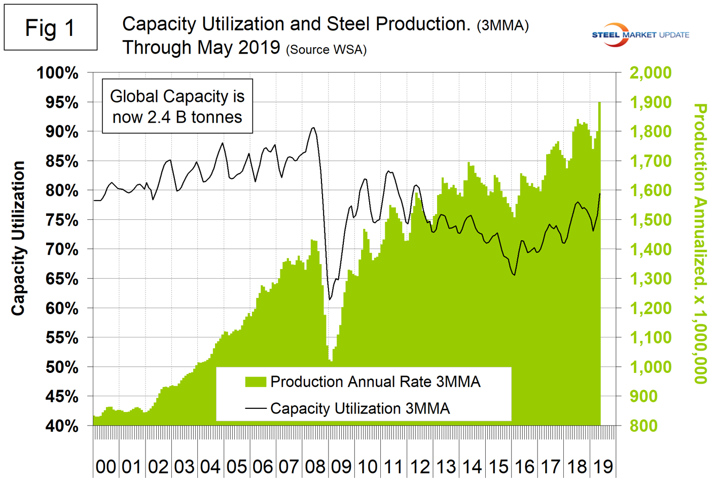 Figure 1 shows annualized monthly production on a three-month moving average (3MMA) basis and capacity utilization since May 2000. On a tons-per-day basis, production in May was 5.25 million Mt, another all-time high.