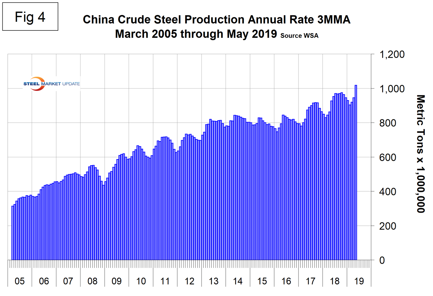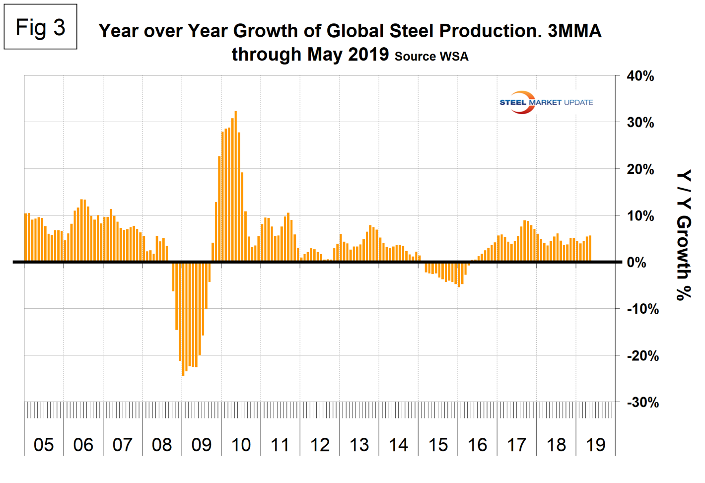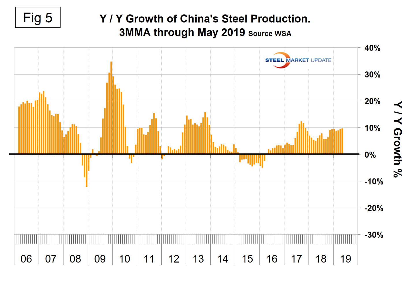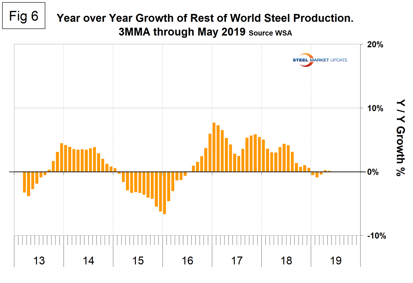 Figure 5 shows the growth of China’s steel production since January 2013 and Figure 6 shows the growth of global steel excluding China. China’s domination of the global steel market is increasing and in April and May for the first time had an annualized production rate of over one billion metric tons. The WSA is forecasting a deceleration in China’s steel production growth in 2019. The chairman of the World Steel economics committee stated recently that China is expected to experience zero growth in 2019, down from 6 percent in 2018. This is partly a result of trade tensions with the U.S. Five months into 2019 it is now obvious that this was an extraordinary conclusion.