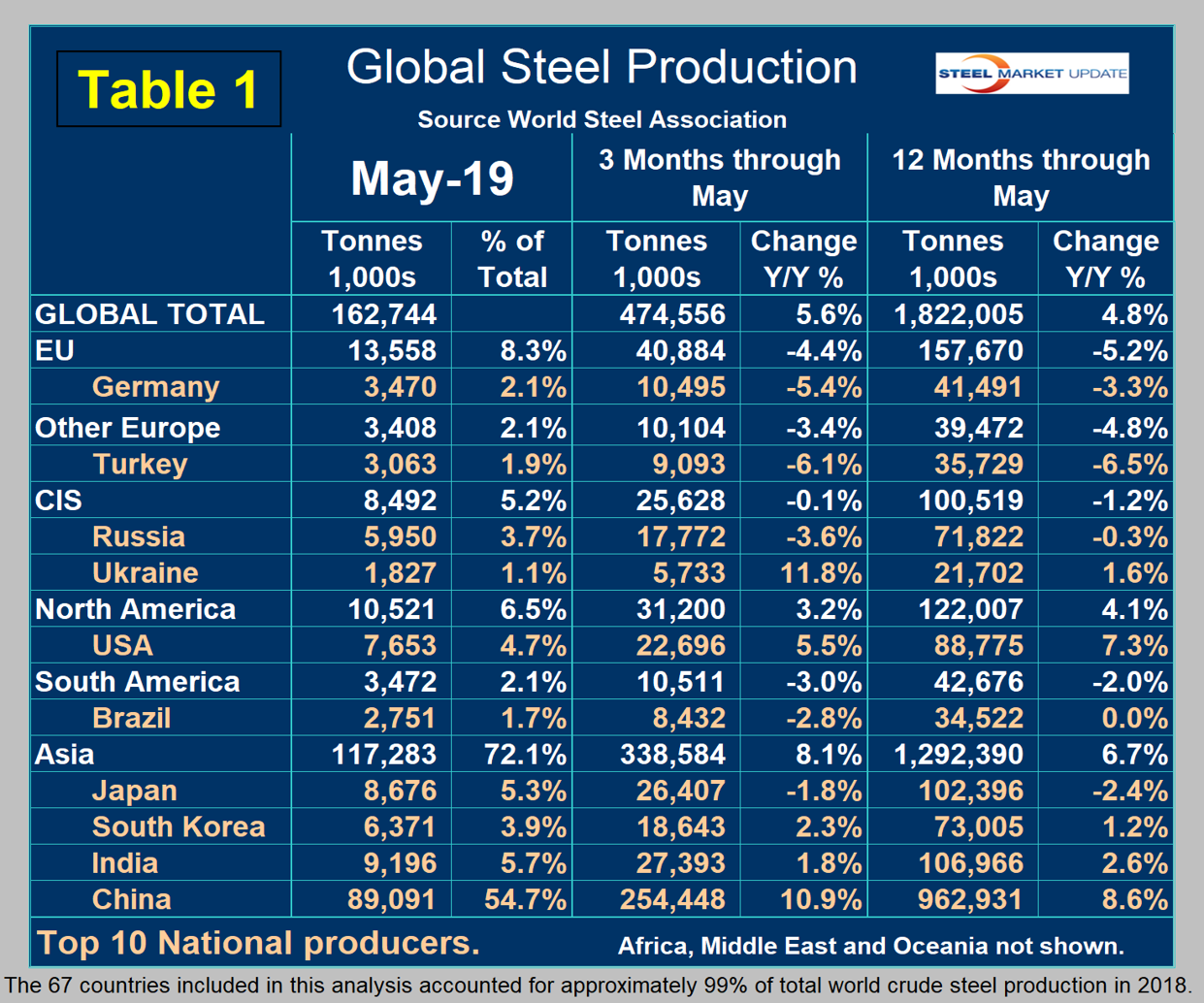 SMU Comment: Each new month of data that we receive from the WSA gets worse in terms of the balance of production between China and the rest of the world. May continued that trend and the WSA continues to be complacent about it. In their October statement, they said they expected the growth of China’s steel production in 2019 to be zero. How wrong can they be! Now they are saying, “In 2020, a minor contraction in Chinese steel demand is forecasted as government led stimulus effects are expected to subside.” New plants are coming on stream in China and almost all of these are BOF-based, according to the March report by the OECD Steel Committee.