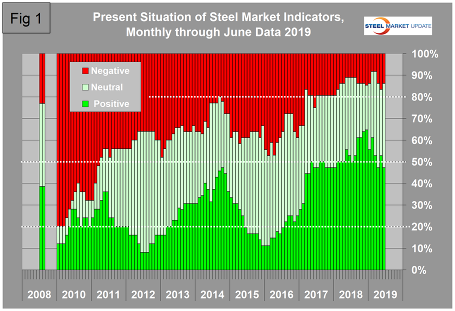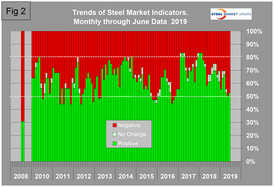 Our view of the June data is that the present situation is still strong, but there has been a deterioration since February. The number of indicators regarded negatively hasn’t changed much in a year and a half, but the number regarded positively has declined since December last year. This means that the number regarded as historically mid-range (normal) has increased from seven to 14 between December 2018 and June 2019. Figure 1 shows the history of our view of the present situation data since January 2010 on a percentage basis and on the far left of the chart is the August 2008 situation immediately before the recession struck the steel business in September that year. Our view of the June data is that of the 36 indicators, 17 are currently positive, 14 are normal and five are negative. This was a decrease of two in the number of indicators that we consider positive, a decrease of one negative and an increase of three normal since our May update. Our intent in using the word normal is to say that this indicator is in the mid-range of historical data. Since the end of May, our view of the Chicago Fed National Activity Index improved from negative to normal and our view of the prices of both coking coal and hot band deteriorated from positive to normal. There were no changes in our view of the long products steel section or in the construction and manufacturing sections.