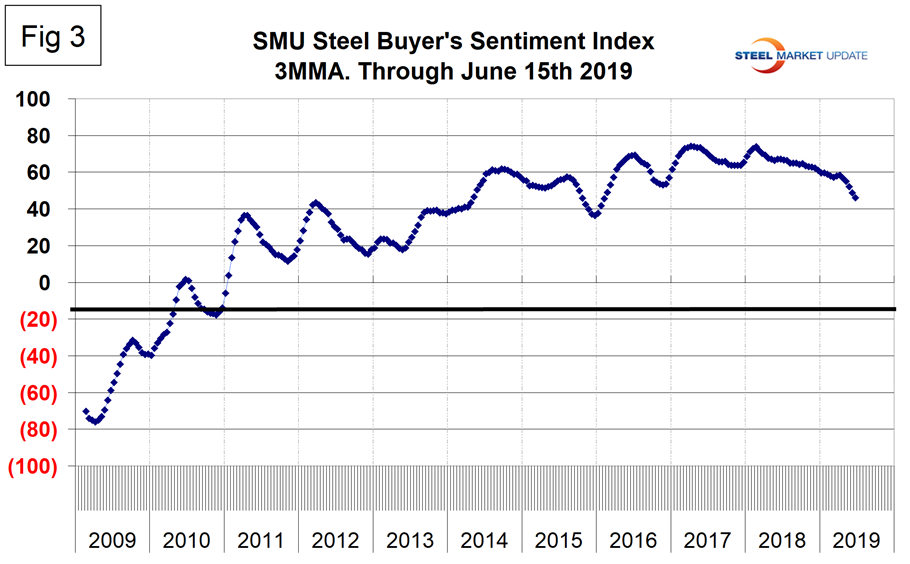 As a reality check for this report we include here Figure 3, which is SMU’s Steel Buyers Sentiment Index. Readings are developed through the SMU market surveys that are conducted twice per month. SMU Steel Buyers Sentiment is a measure of the current attitude of North American buyers and sellers of flat rolled products regarding their company’s opportunity for success in today’s market. A reading above the neutral point of zero indicates that a preponderance of buyers have a positive attitude. The index has been deteriorating since mid-February last year. The mid-June value was still positive 46.0, but down from a peak of +78 in January 2018