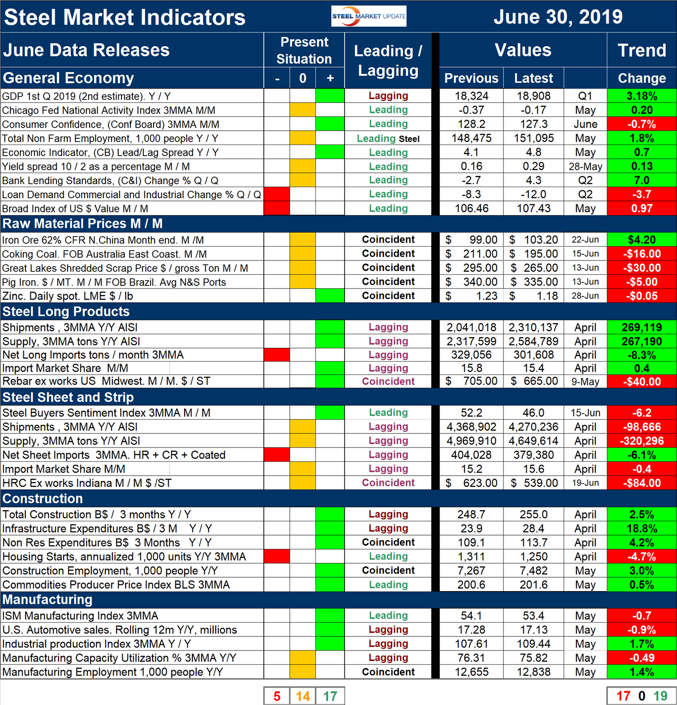 Trend changes in the June data were as follows: In the general economy, the yield spread and the Chicago Fed National Activity index reversed direction and improved as consumer confidence moved in the opposite direction. In the raw materials section in June, only the price of iron ore was trending positive; coking coal reversed direction when the price declined. In the two steel sections, the import market share of long products declined (positive) and the import market share of sheet products increased (negative.). There were no trend reversals in the construction and manufacturing sections of the report. Five of the six construction indicators are trending positive and three of the five manufacturing indicators are trending negative.