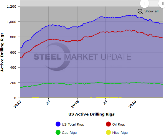 The U.S. active rotary rig count, an indicator of oil country tubular goods demand, remained steady this week, according to oilfield services company Baker Hughes. The number of active U.S. rigs remained the same at 967, with oil rigs up 4, gas rigs down 4, and miscellaneous rigs unchanged. Compared to this time last year, the 967 count is down 80 rigs, with oil rigs down 65, gas rigs down 14, and miscellaneous rigs down 1. See the first graph below for a history of active U.S. rig counts.
