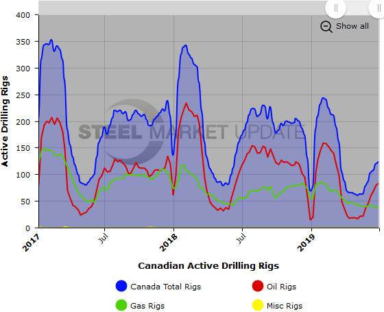 The Canadian rig count rose by 5 to 124 rigs, with oil rigs up 4 and gas rigs up 1. Compared to last year, the 124 count is down 48 rigs, with oil rigs down 33 and gas rigs down 15. See the second graph below for a history of active Canadian rig counts.