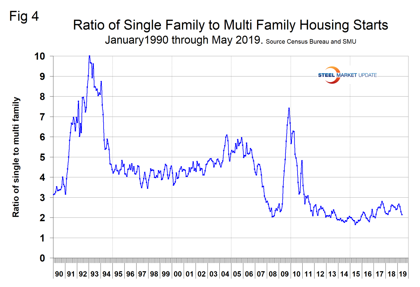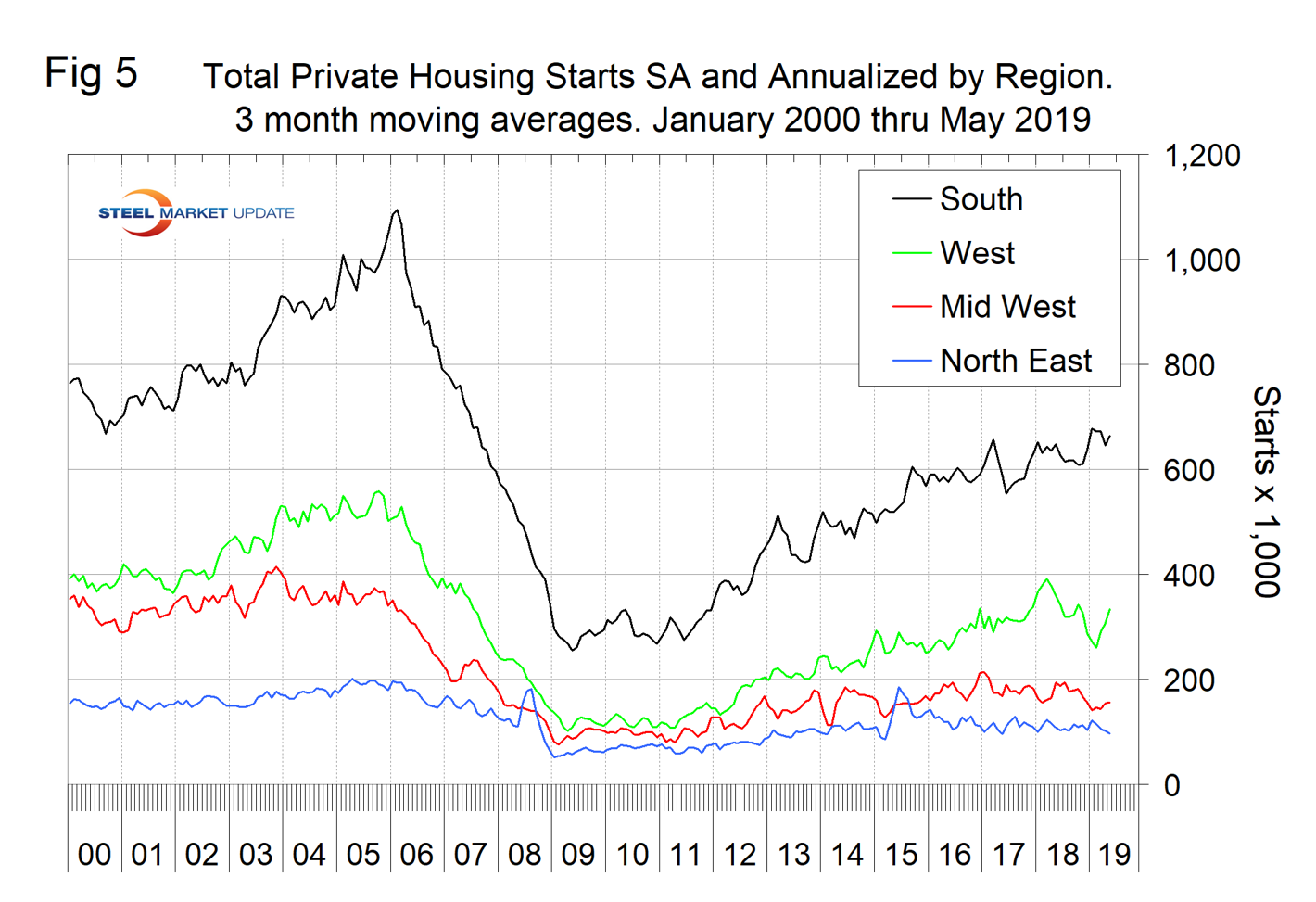 Excluding property improvements, single-family residential contracted by 6.5 percent in three months through May with negative momentum and multifamily residential grew by 8.9 percent with positive momentum. Total housing starts as reported by Census Bureau have been contracting on a year-over-year basis since October last year. The National Association of Home Builders optimism index improved in each of the months February through May this year, which flies in the face of negative data for CPIP and starts. The Census Bureau reports on construction starts in their housing analysis. In the starts data, the whole project is entered into the database when ground is broken. Construction put in place is based on spending work as it proceeds; the value of a project is spread out from the project’s start to its completion. Single-family starts declined by 7.0 percent in the three months through May year over year, which was about the same as the contraction rate of CPIP. Multifamily starts expanded by 0.5 percent, which was a much worse result than the rate of expansion indicated by the CPIP data. Figure 3 shows the growth of both housing sectors since January 2005 and Figure 4 shows the ratio of single-family to multi-family starts. The proportion of single-family has been gradually increasing since January 2015 when the ratio was 1.66 in favor of single units to 2.66 in February before declining to 2.14 in May 2019. Figure 5 shows total housing starts in four regions with the South being the strongest and the Northeast the weakest.