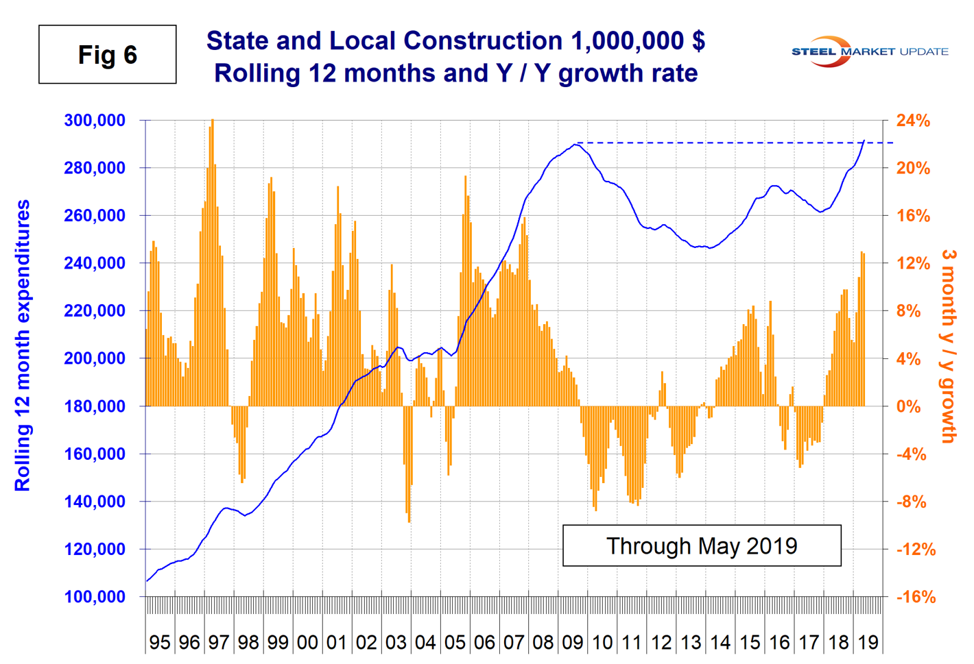 Apart from a slight dip in November and December last year, the growth rate of S&L work has improved steadily since January 2018. In May, the year-over-year growth rate on a rolling three-months basis was 12.8 percent, which completed three back-to-back months of double digit expansion (Table 3). S&L nonresidential building had slightly negative momentum in May, but still grew at 9.1 percent year over year. Educational was by far the largest subsector of S&L nonresidential building at $6.5 billion in May and experienced 7.3 percent positive growth on a rolling three months basis with positive momentum. Figure 6 shows the history of total S&L expenditures. May 2019 set an all-time record for S&L expenditures, breaking the previous best of July 2009. This has been an abrupt turnaround since the end of 2017.
