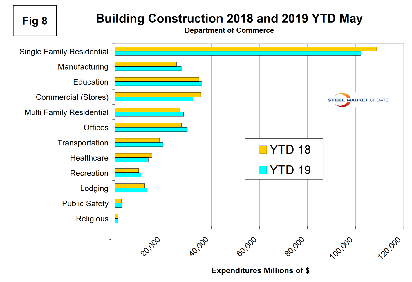 Figure 8 compares year-to-date expenditures for the construction of the various building sectors for 2018 and 2019. Single-family residential is dominant and in the 12 months of 2018 totaled $281.8 billion, up from $242.5 billion in 2016.