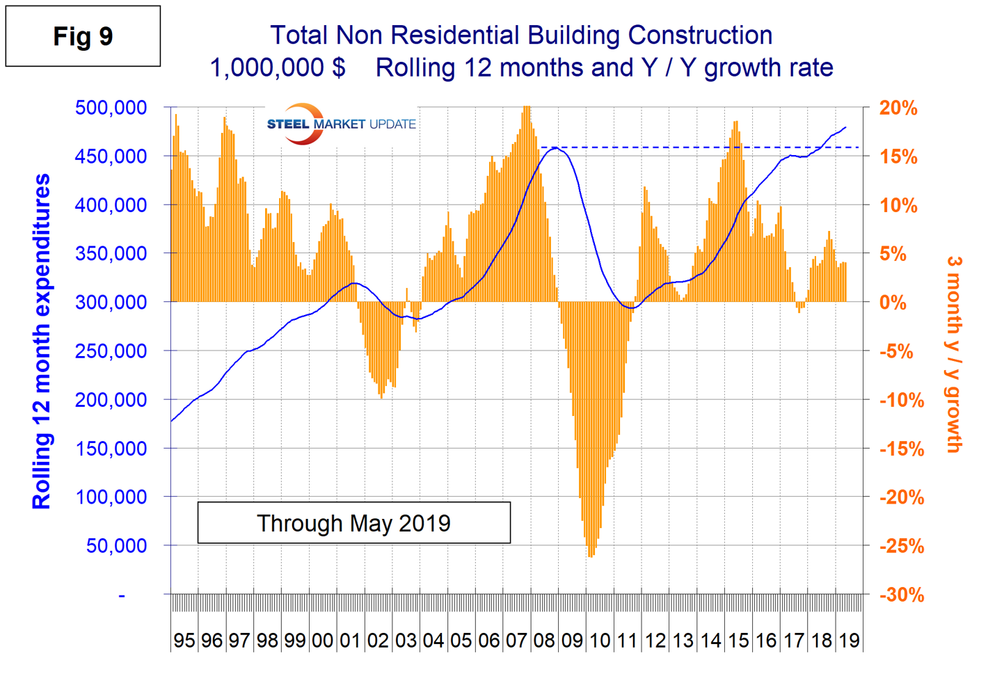 Figure 9 shows total expenditures and growth of nonresidential building construction. On a rolling 12-months basis, expenditures on nonresidential buildings including both private and S&L are at an all-time high and growth has been in the 5 percent range for over a year.