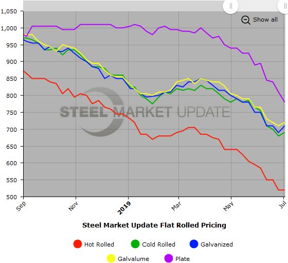 SMU Note: Below is a graphic showing our hot rolled, cold rolled, galvanized, Galvalume and plate price history. This data is available here on our website with our interactive pricing tool. Note that plate prices are not yet available on our website, but we are in the process of adding that dataset. If you need help navigating the website or need to know your login information, contact us at info@SteelMarketUpdate.com or 800-432-3475.