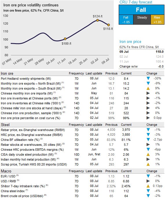The high volatility in the iron ore market continues. After peaking on June 2, iron ore prices fell sharply at the end of last week before rebounding on Monday and Tuesday. On July 9, CRU has assessed the 62% Fe iron ore price at $118 /t, down $6.00 w/w.
