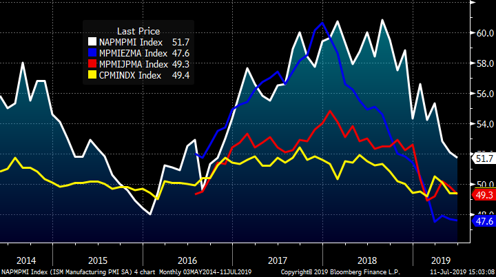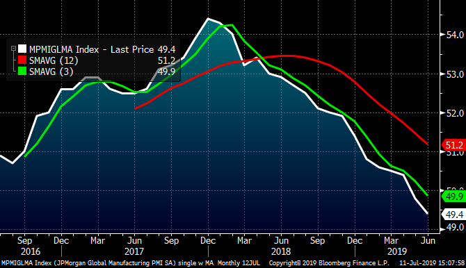 The J.P. Morgan Manufacturing PMI fell to 49.4 for its second consecutive month in contraction. The thing about this downright awful data is it forces action. The ECB joined many other global central banks already easing rates and providing economic stimulus while U.S. Federal Reserve Chairman Jerome Powell signaled this week that the Fed will cut rates at its next policy meeting.