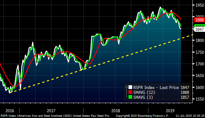 Also in that article, it was noted that the AISI Crude Steel Production level had begun to roll over and it has continued to trend lower since. Curtailing supply will be a critical factor in whether prices continue higher or retest the low.