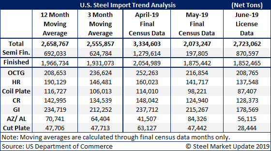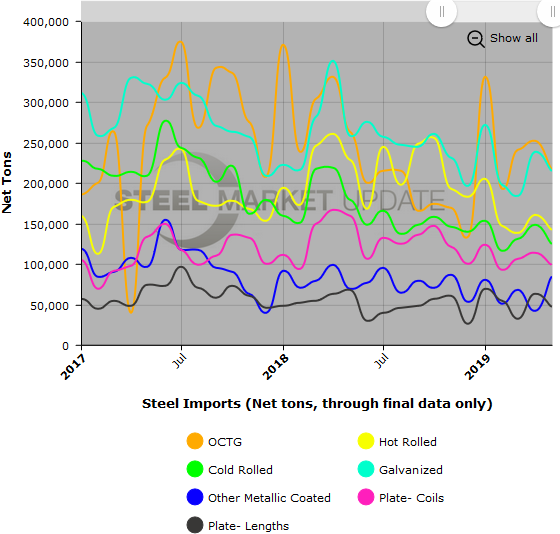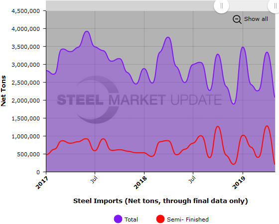 Below are two graphs covering steel imports through final May 2019 figures. You will need to view the graphs on our website to use their interactive features; you can do so by clicking here. If you need assistance logging into or navigating the website, contact us at info@SteelMarketUpdate.com.