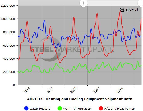 Below is a graph showing the history of total water heater, warm air furnace and air conditioner shipments. You will need to view the graph on our website to use it’s interactive features; you can do so by clicking here. If you need assistance with either logging in or navigating the website, contact info@SteelMarketUpdate.com.