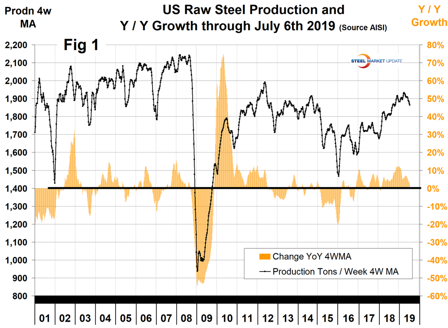 Figure 1 shows that the robust growth of U.S. raw steel production that occurred last year has slowed in 2019, but is still positive 2.7 percent year over year through July 6. This is a four-week moving average and is based on weekly data from the AISI.