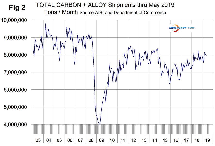 The shipments and supply report that you are reading now is based on monthly shipments by product as reported by the AISI plus import and export data from the Department of Commerce. Figure 2 shows the monthly shipment data for all rolled steel products. In the long run, the trajectories of growth in Figures 1 and 2 are basically the same.