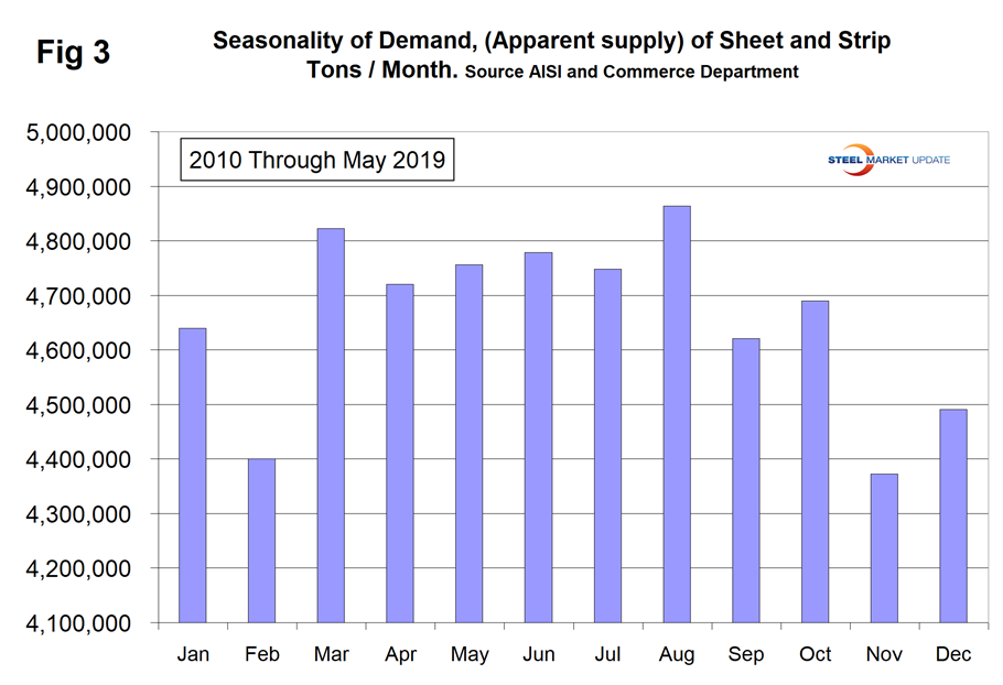 Table 3 shows that total supply of sheet and strip products including hot rolled, cold rolled and all coated products decreased by 5.9 percent year-to-date and increased by 6.3 percent comparing three months through May with three months through February. This latter increase is a seasonal effect as shown in Figure 3.