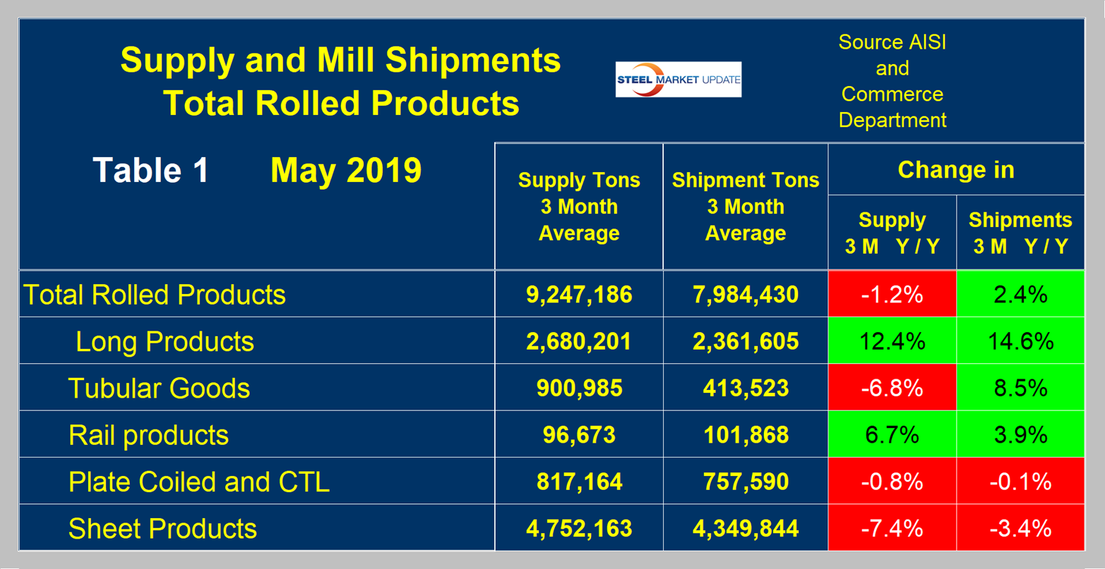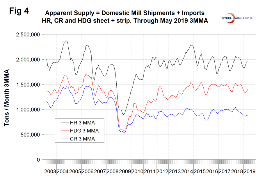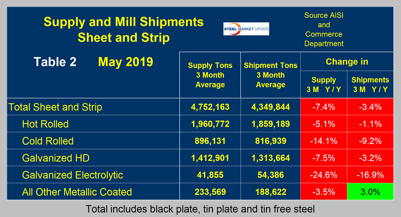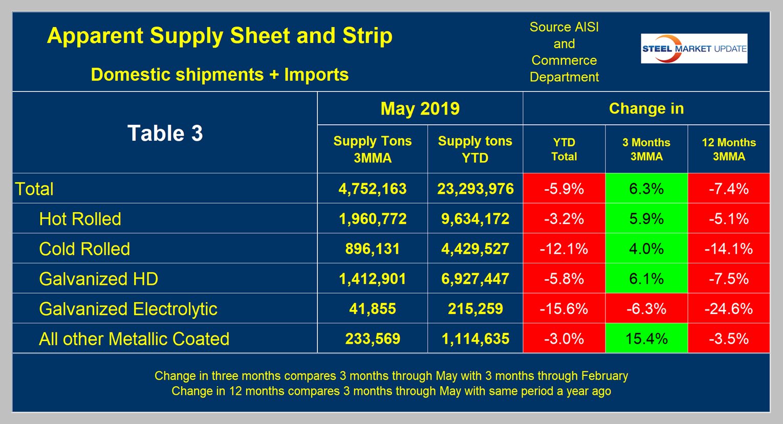 Table 2 describes both apparent supply and mill shipments of sheet products (shipments includes exports) side by side as three-month averages through May with year-over-year growth rates for each. Comparing the year-over-year time periods, total supply of sheet products to the market decreased by 7.4 percent and mill shipments decreased by 3.4 percent. Table 2 breaks down the total into product detail and shows that supply was down for all five sheet products considered in this report. Cold rolled and electrogalvanized were particularly week. Domestic mill shipments were down year over year for all products except other metallic coated, which is mainly Galvalume. Apparent supply is defined as domestic mill shipments to domestic locations plus imports. In the three months through May 2019, the average monthly supply of sheet and strip was 4.752 million tons. There is no seasonal manipulation of any of these numbers. By definition, year-over-year comparisons have seasonality removed. Table 2 shows the change in supply by product on this basis through May.