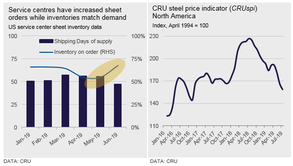 While the need for a later-summer inventory build may now be somewhat diminished for sheet products (see chart), domestic supply is lower due to U.S. Steel’s production cuts. However, we do expect this to allow producers in Canada and Mexico to regain some market share as they are now able to export without S232 tariffs. Demand, meanwhile, may not provide as much support as we previously expected. Industrial growth is slowing or in some cases has been neutral at best. Indeed, the latest manufacturing PMI report for June shows new orders, imports and new export orders all at a neutral level. Some of this weakness is due to the business cycle slowing, yet more blame is being placed on non-steel tariffs. Regardless, industrial economic activity in 2019 H2 does not appear to be supportive of a sustained up-cycle for steel prices.