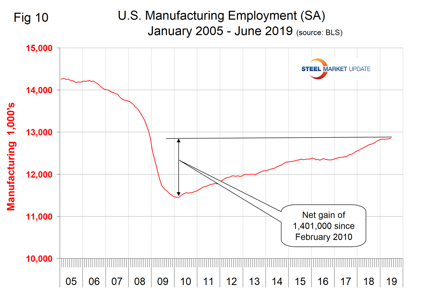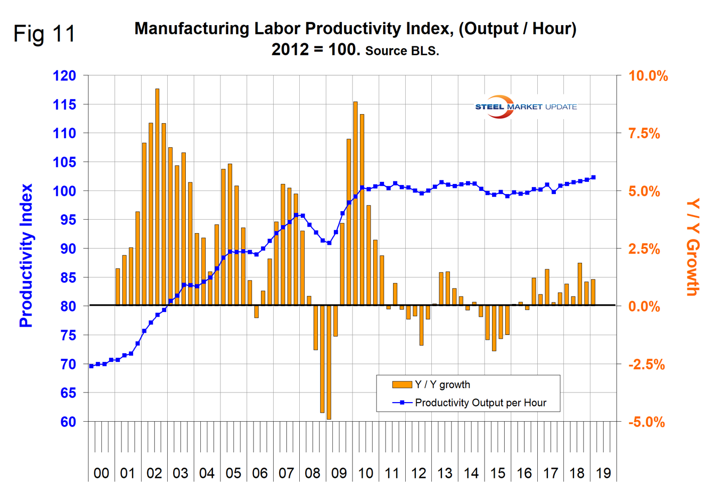 The Bureau of Labor Statistics reported that in Q1 2019 manufacturing productivity completed three back-to-back quarters of growth over 1.0 percent, the best performance since 2010 (Figure 11).