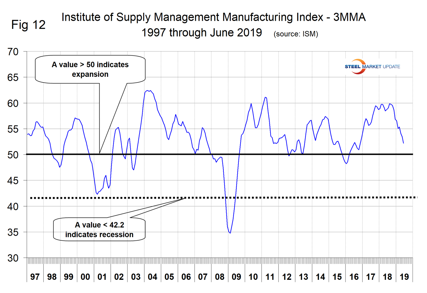 The Institute for Supply Management’s Manufacturing Index is a diffusion index. ISM states: “Diffusion indexes have the properties of leading indicators and are convenient summary measures showing the prevailing direction of change and the scope of change. An index value above 50 indicates that the manufacturing economy is generally expanding; below 50 indicates the opposite.” Figure 12 shows the 3MMA of the ISM index from January 1997 through June 2019. The index surged from January 2016 through October 2017, leveled off through October 2018 and has declined since then. The index had a value of 51.7 in June with a 3MMA of 52.2, down by 6.5 points year over year.