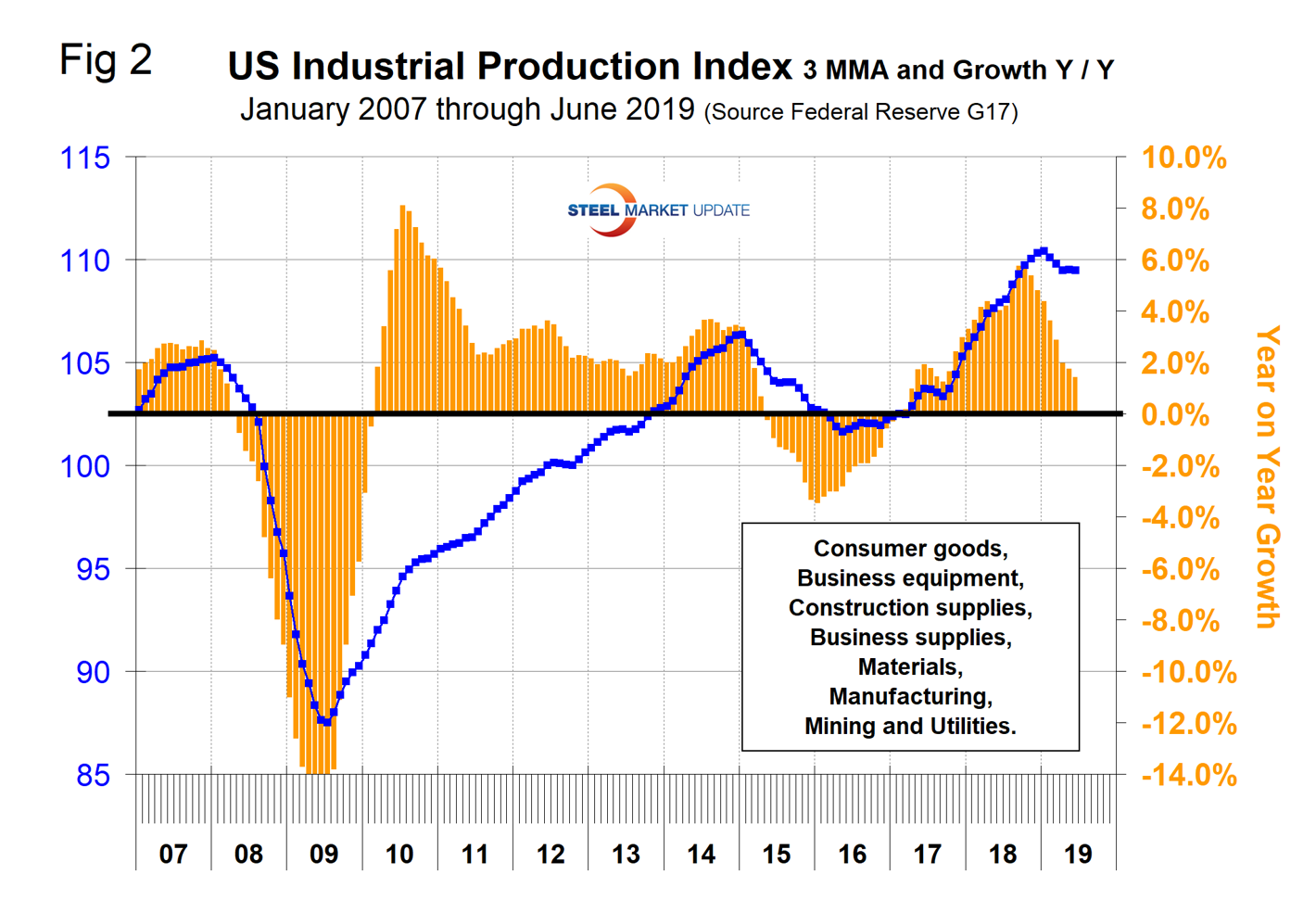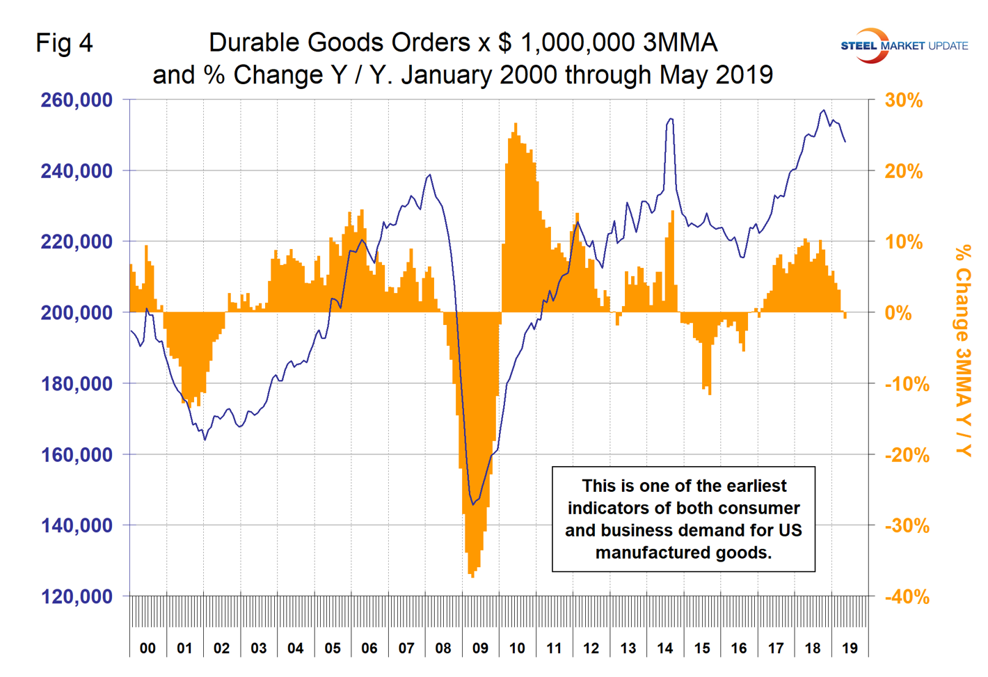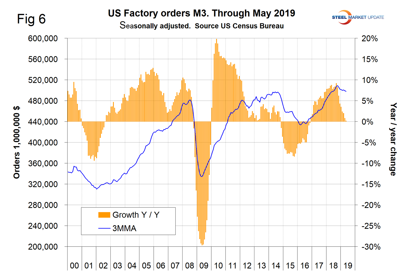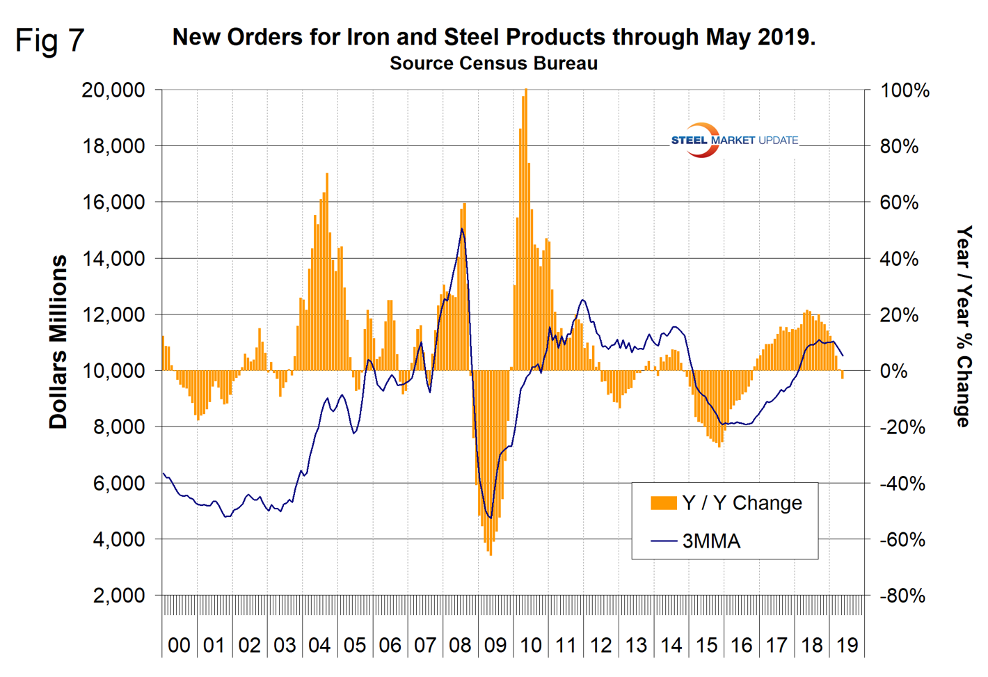 Within the Census Bureau M3 manufacturing survey is a subsection for new orders for Iron and Steel products. Figure 7 shows the history since January 2000. The year-over-year growth rate has declined from 21.6 percent in March last year to negative 3.0 percent in May 2019. Growth has declined every month since last September.