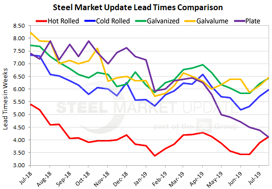 Hot rolled lead times now average 4.11 weeks, up from 3.88 weeks in early July. Hot rolled lead times were one week longer in the high-demand period at this time last year.