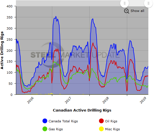 The Canadian rig count rose by 9 to 117 rigs, with oil rigs up 2 and gas rigs up 7. Compared to last year, the 127 count is down 96 rigs, with oil rigs down 69 and gas rigs down 27. See the second graph below for a history of active Canadian rig counts.