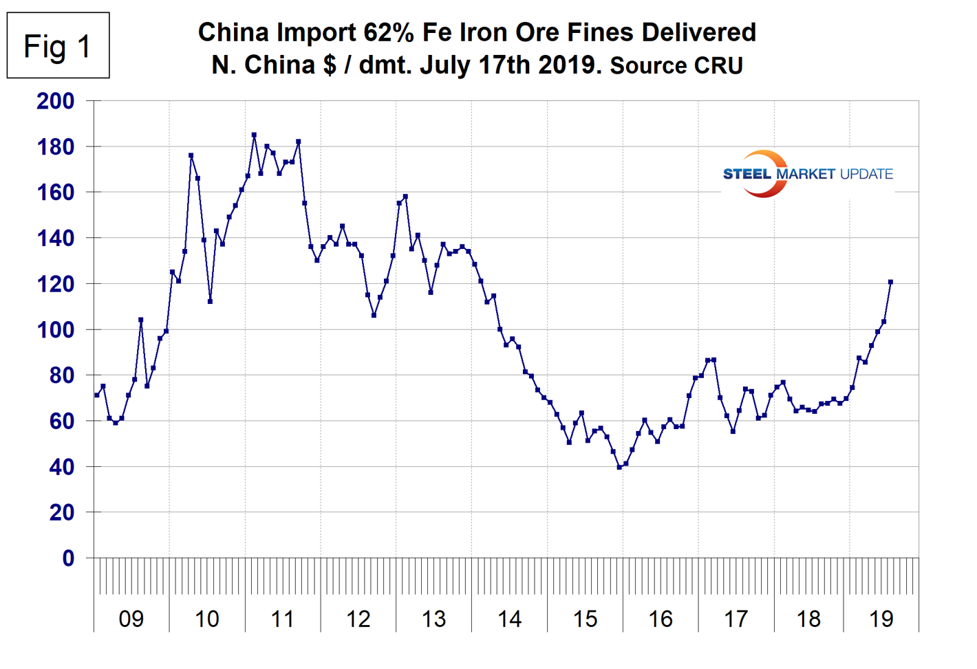 Based on CRU’s data, the weekly average spot price of 62% fines delivered North China was $120.50 per dry metric ton on July 17, up from $103.20 on June 17. The price has increased every month this year and is up from $69.50 in mid-January. Figure 1 shows the price of 62% Fe delivered North China since January 2009. The price of ore has broken out of the $20 range that prior to February 2019 had existed for a year and a half.