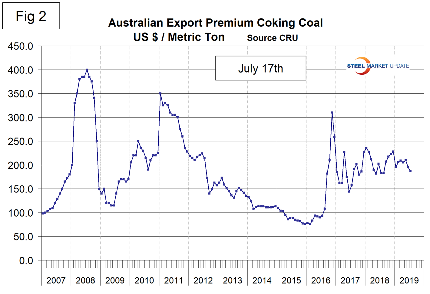 The price of premium low volatile coking coal FOB east coast of Australia declined in June and July and has been trading in a $23 range for the first half of 2019. The July price is $187 per metric ton, down from $210 in May (Figure 2).