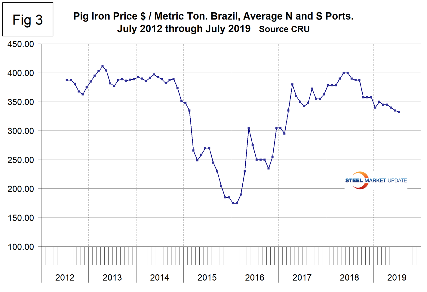 Most of the pig iron imported to the U.S. currently comes from Russia, Ukraine and Brazil with additional material from South Africa and Latvia. In this report, we summarize prices out of Brazil and average the FOB value from the north and south ports. The price had a recent peak of $400 per metric ton in May and June last year and had fallen to $332.50 in July this year. The average price in July was 14.7 percent lower than in July last year (Figure 3).