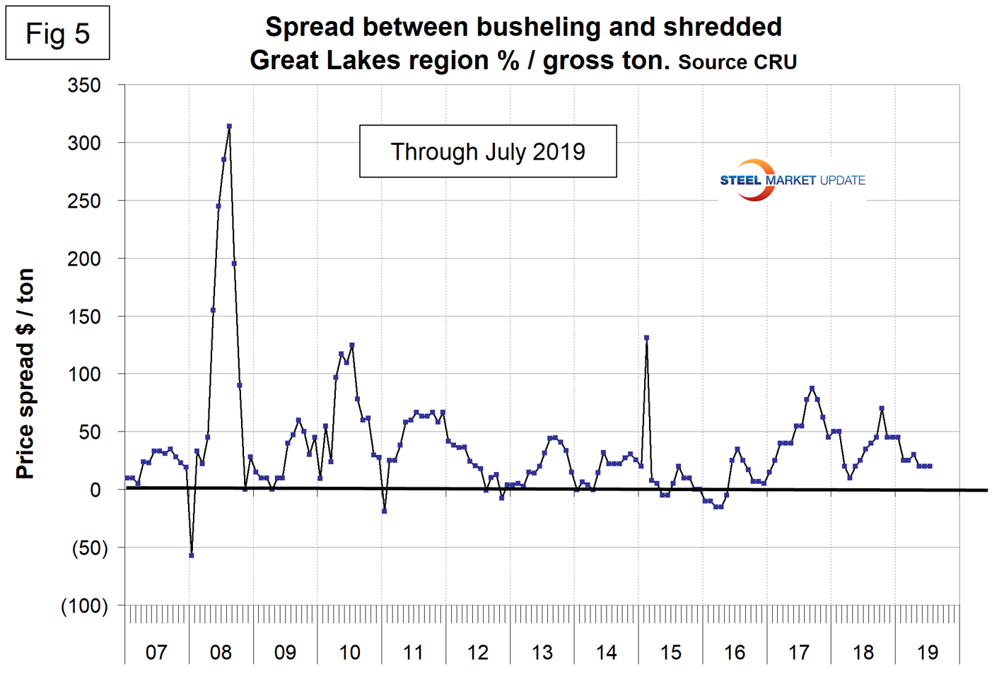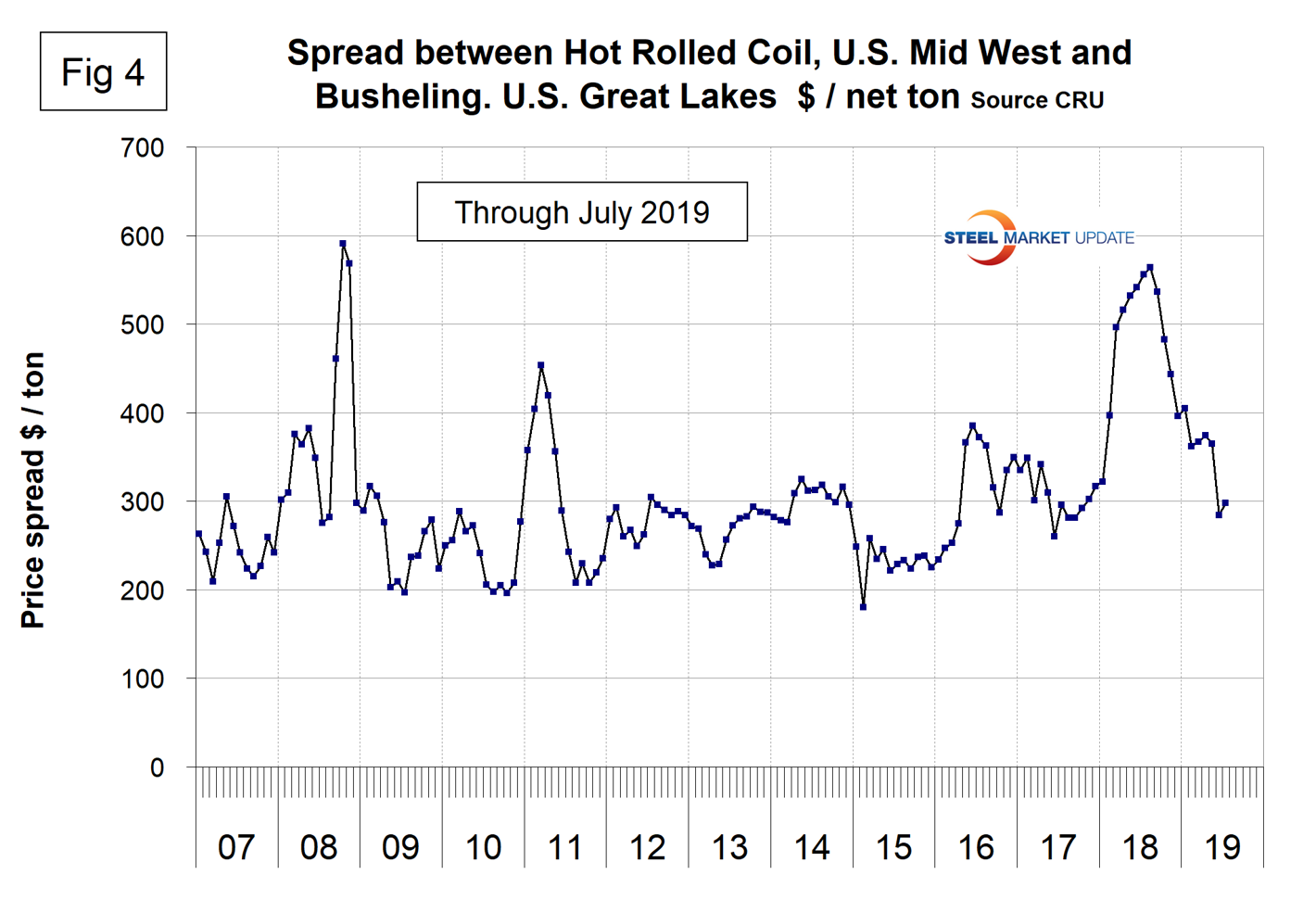 To put this raw materials commentary into perspective, we include here Figure 4, which shows the spread between busheling in the Great Lakes region and hot rolled coil Midwest U.S. through mid-July 2019, both in dollars per net ton. The spread has collapsed from $564 in August last year to $298 in July 2019 and is now in a range more historically normal for the last 12 years.