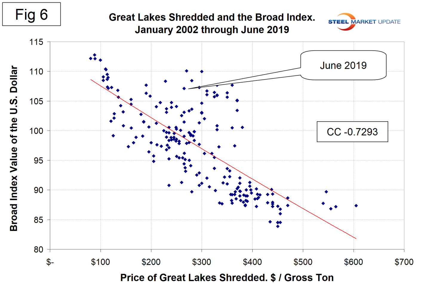 Figure 6 is a scatter gram of the price of Chicago shredded and the monthly Broad Index value of the U.S. dollar as reported by the Federal Reserve. The latest data for the monthly Broad Index was June. This is a causal relationship with a negative correlation of almost 73 percent.