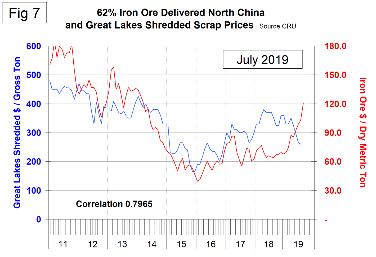 There is a long-term relationship between the prices of iron ore and scrap. Figure 7 shows the prices of 62 percent iron ore fines delivered North China and the price of shredded scrap in the Great Lakes region through mid-July 2019. The correlation since January 2006 has been over 79 percent. There was a very unusual divergence in these prices in 2017 and 2018 that benefited the integrated producers, but that advantage has now reversed to the extent that the EAF producers have the greatest advantage since November 2011.