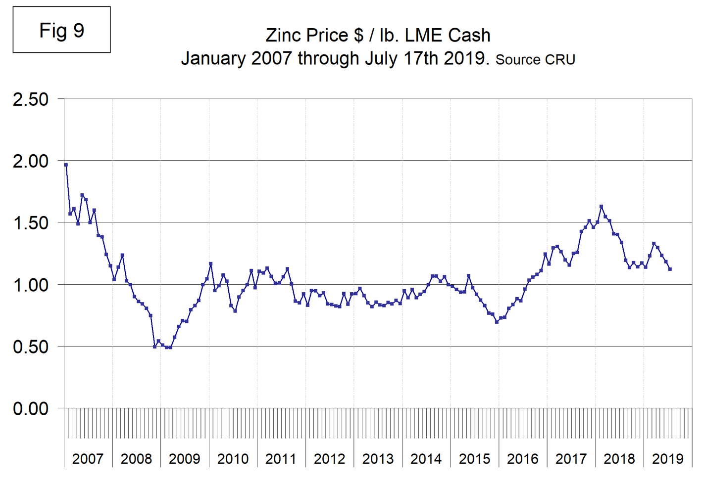 The LME cash price for zinc mid-month is shown in Figure 9. The latest data is for July 17 when the price was $1.12 per pound, down from $1.33 in mid-March.
