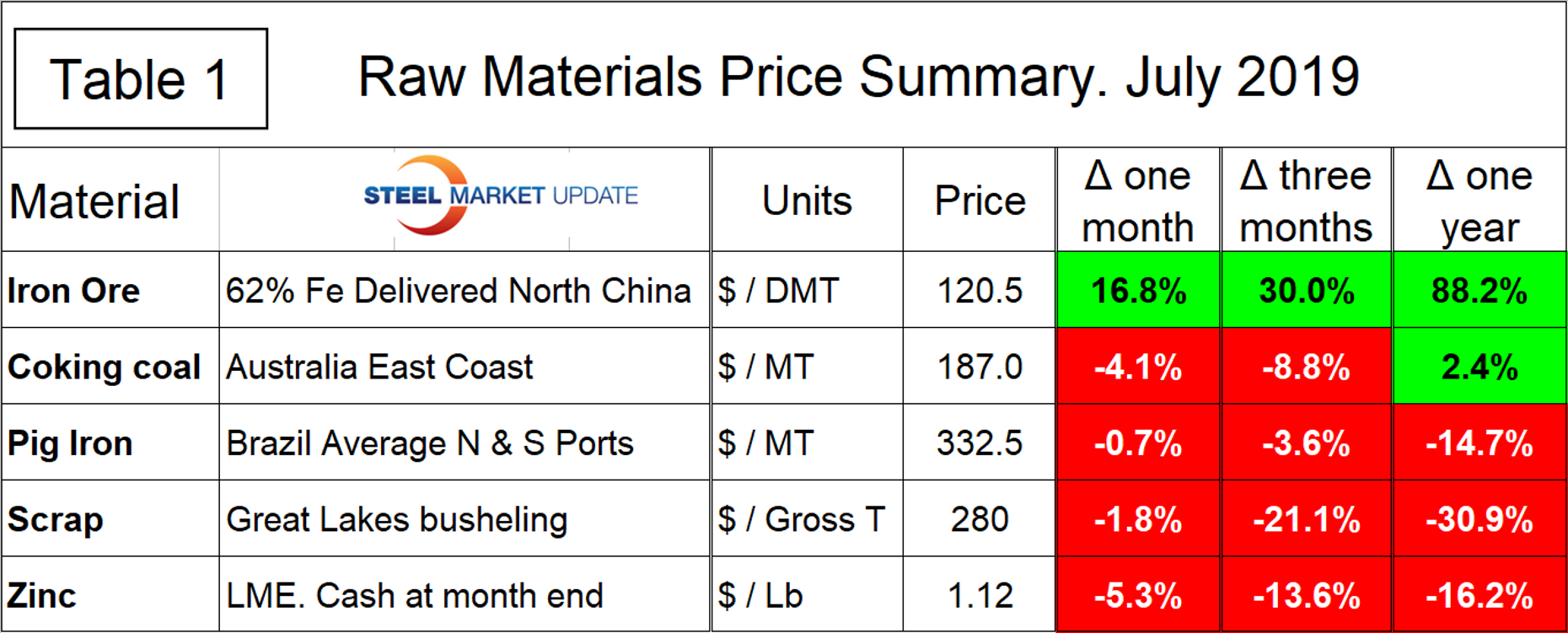 Table 1 summarizes the price changes through July of the five materials considered in this analysis. It reports the month/month, 3 months/3 months and 12 months/12 months changes and tells us that iron ore and scrap have moved in opposite directions for over a year and coking coal, pig iron and zinc prices have declined in the last three months.