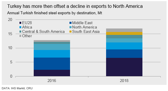 Turkish mills have recently been struggling with weak domestic demand. CRU expects this to continue at least for the remainder of 2019. The Turkish domestic market hit a downturn last year, and quarterly demand for steel plummeted by 43 percent between 2017 Q4 and 2019 Q1. While some mills scaled back production, others switched their focus to the export markets instead, particularly the EU markets. At the same time, trade defense measures taken by the U.S. against Turkish steel meant that mills only had limited access to this traditionally strong market.