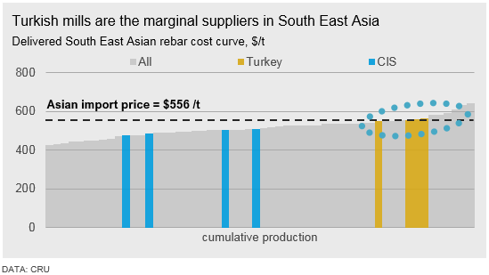 South East Asia: The South East Asian market is highly appealing – as a developing market, countries in the region have high and growing steel demand but have insufficient domestic capacity to account for this. However, Turkish mills must compete with Chinese and Russian mills in the region, competitors that have both the advantage of a lower cost base as well as lower freight rates. This has left Turkey as the marginal producer in the region, where they will enter and leave based on market conditions. As such, Turkish prices play a large role in setting the market price level in the region.