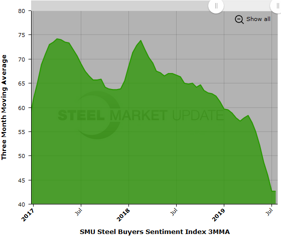 SMU Steel Buyers Sentiment Index is a measurement of the current attitude of buyers and sellers of flat rolled steel products in North America regarding how they feel about their company’s opportunity for success in today’s market. It is a proprietary product developed by Steel Market Update for the North American steel industry.
