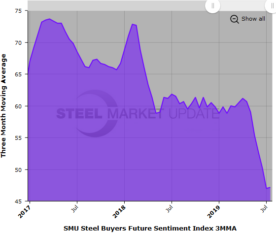 The goal of SMU’s Buyers Sentiment Index is to measure how buyers and sellers of steel feel about their company’s ability to be successful today (Current Sentiment Index), as well as three to six months into the future (Future Sentiment Index). Results are posted as both single data points and as three-month moving averages (3MMAs) to smooth out the trend.