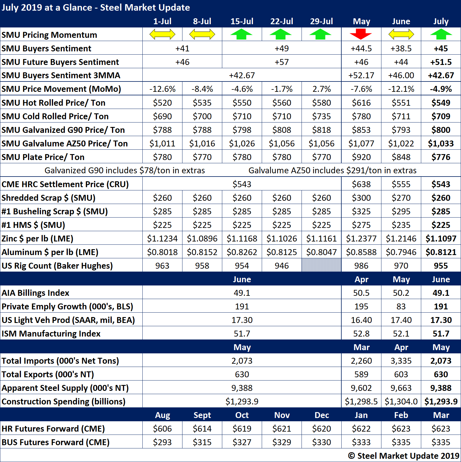 The long-awaited rebound in steel prices was the biggest story of the month in July. Steel Market Update’s Price Momentum Indicator was pointing firmly upward by the end of the month following three $40 price increase announcements by flat rolled steel producers. The benchmark price of hot rolled steel hit $580 per ton in July, up more than 10 percent from the beginning of the month. Cold rolled and galvanized saw similar increases. The market for plate steel remains under pressure, however, with the average price declining to $770 per ton during the month.