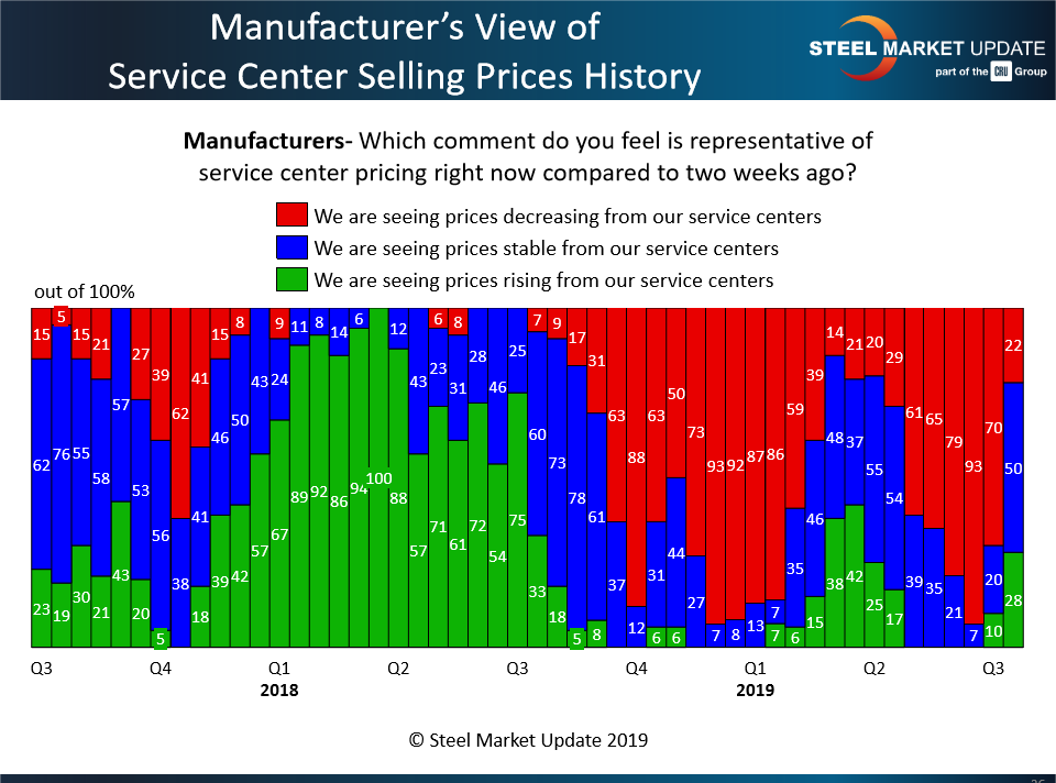 Corroborating the trend, just 22 percent of the manufacturers responding to SMU’s latest market trends questionnaire said they are still seeing lower prices from their service center suppliers. That’s down from nearly all (93 percent) who reported declining service center prices in June. Twenty-eight percent said they are now seeing higher prices from service centers. The biggest group, half of the manufacturers, characterize service center prices as stable, neither increasing nor decreasing.