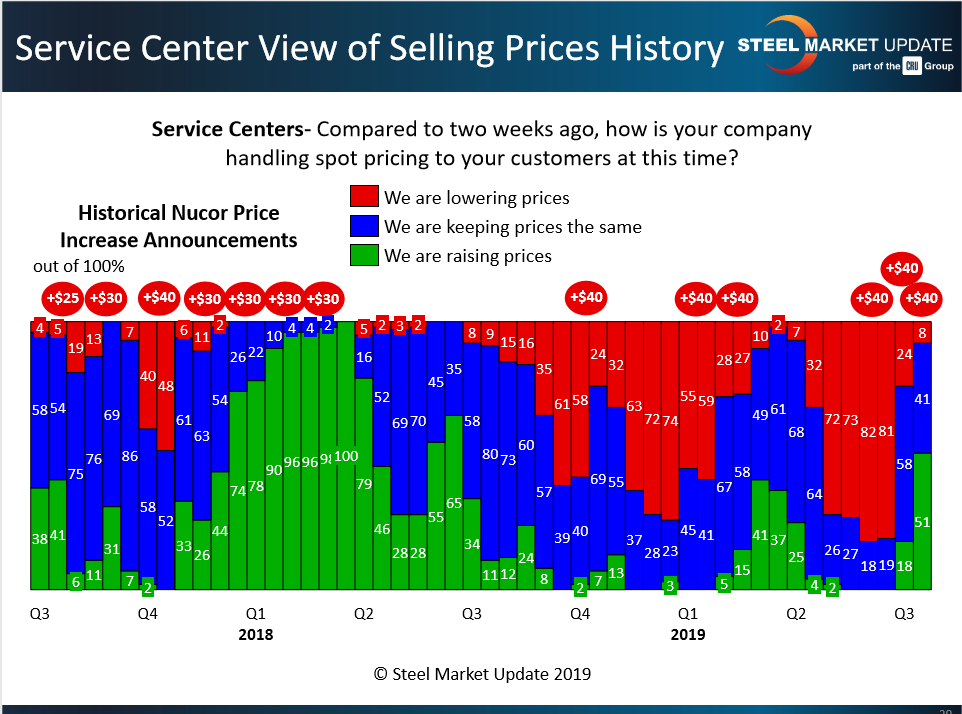 As seen in the chart below, 81 percent of the service centers polled by Steel Market Update just six weeks ago said they were lowering prices to customers. Last week, only 8 percent said they were offering lower prices, while the majority, 51 percent, said they are raising prices.