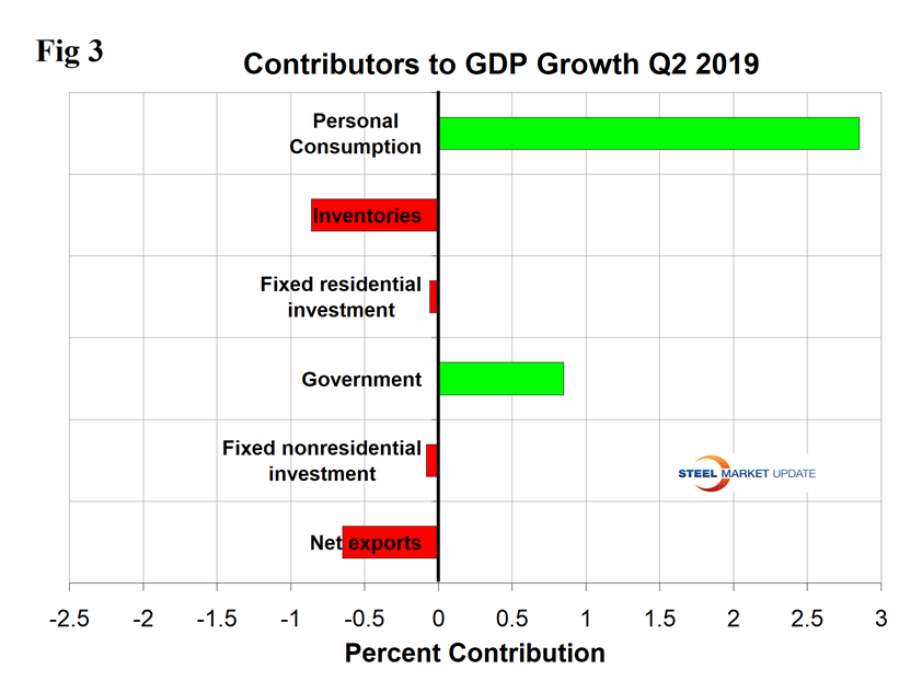 The mix of the six major contributory components in the final GDP growth calculation is shown in Figure 3. Normally, personal consumption is the dominant growth driver, and this was the case in the second quarter when this contribution was 2.85 percent. Personal consumption includes goods and services, the goods portion of which includes both durables and non-durables. Inventory adjustments and net exports detracted from the overall result. Declining inventories are entered as a negative in the GDP calculation. Over the long run, inventory changes are a wash and simply move the reported growth from one period to another.