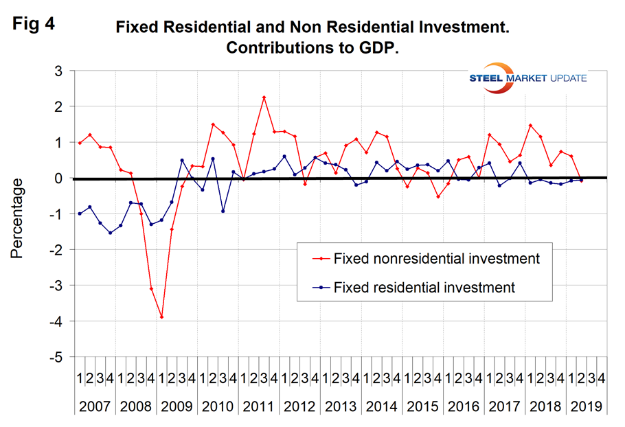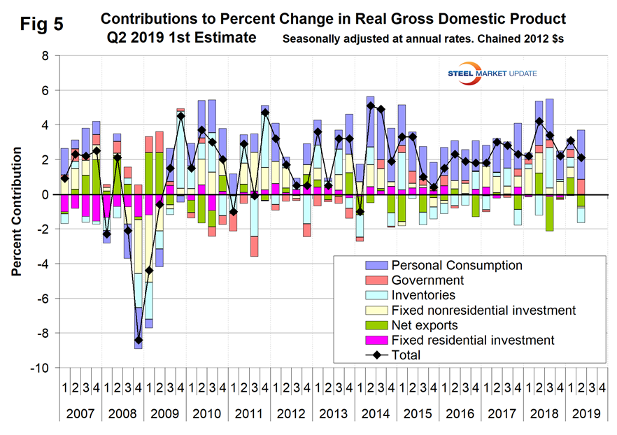 Figure 5 shows the quarterly contributors of the six major subcomponents of GDP since Q1 2007. This chart clearly shows the whipsaw effect of inventory changes, which are coded pale blue. It also shows the unusually low contribution of personal consumption expenditures in the first quarter of 2019.