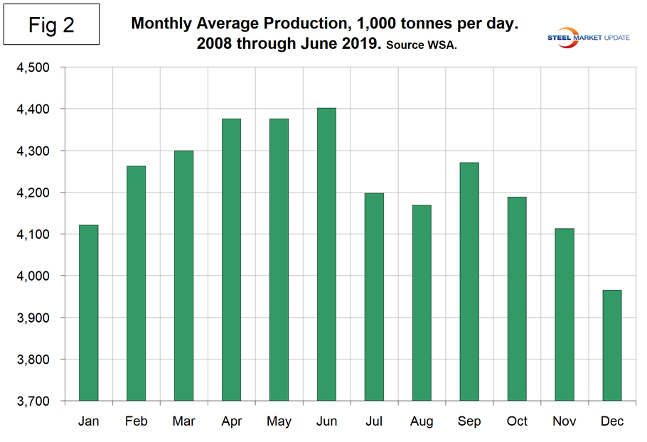 On average, global production in tons per day peaked in the early summer in the years 2010 through 2016, but in 2017 and 2018 the second half downtrend was delayed until the fourth quarter. Figure 2 shows the average tons per day of production for each month since 2008. On average, June increased by 0.58 percent. This year, June increased by 0.82 percent.
