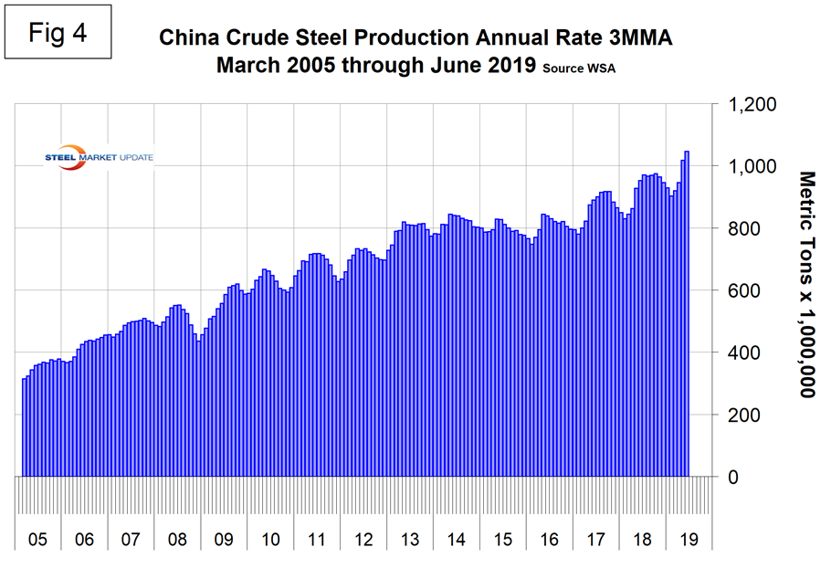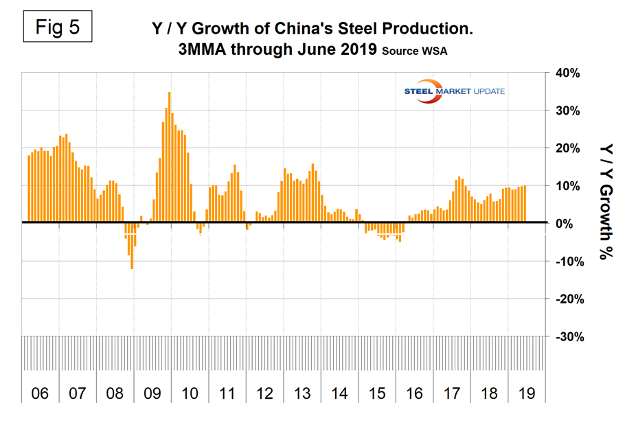 Figure 4 shows China’s production since 2005. As just stated, global steel production was up by 5.4 percent in three months through June year-over-year and China was up by 10.8 percent, both with positive momentum. In the three months April through June, world steel production excluding China contracted by 0.5 percent.